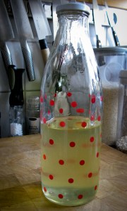 Rör ut så att socker och honung löses upp, och lämna på varm plats med locket på glänt – jag satte min burk jämte spisen på en plats där solen ligger på på morgonen och ger bra värme. Skaka burken två gånger om dagen, men var noga med att inte stänga locket efteråt – kraften i jäsningen är förvånansvärt explosiv. Efter en 4-5 dagar så bubblar det ordentligt i burken, russinen har flutit upp till ytan och det doftar likör…. då är det bara att sila av och spara vätskan. (Russinen kan sparas till brödbak!). Vildjästen kan sparas i kyl i ca. 2 veckor.