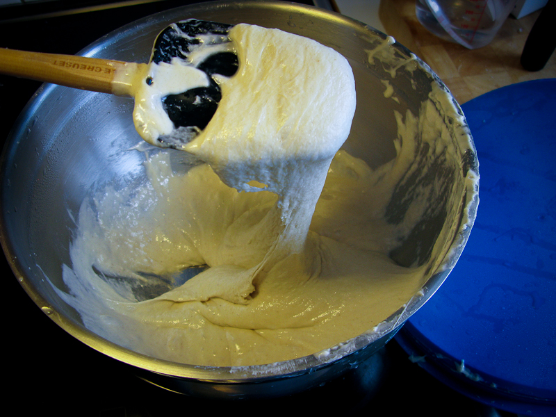 Det ska bli en tjock smet, inte en deg – avpassa med vattenmängden, då det hänger lite på mjölkvaliteten hur mycket vatten det går åt. Nu ska den stå över natten – 8-12 timmar – och växa till sig.