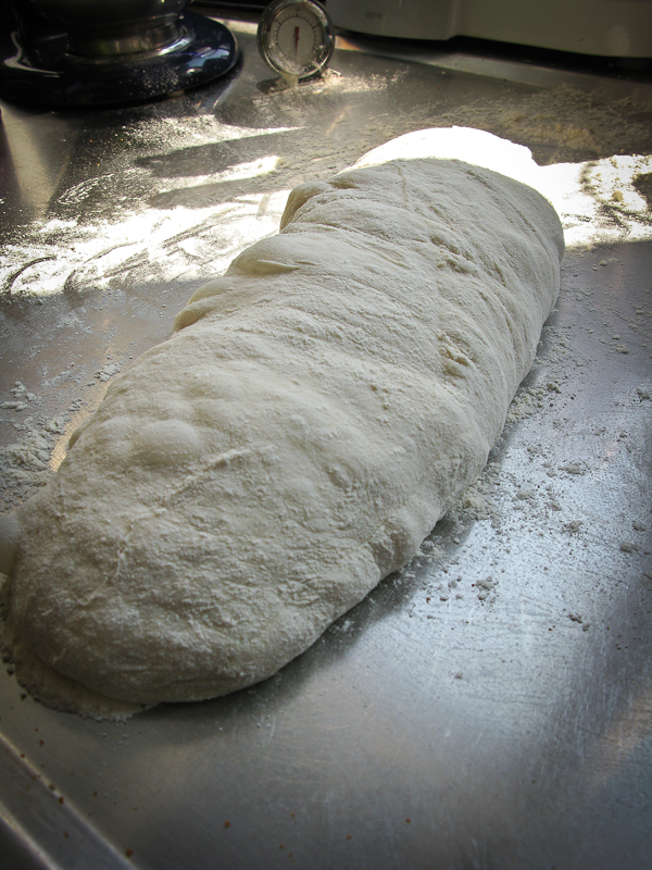 I det här skedet kan man dela upp degen och lägga i jäskorgar för ytterligare jästid, men då jag inte hade tillgång till några så gjorde jag det på enklast tänkbara sätt. Jag mjölade bakbordet generöst, stjälpte upp degen ur bunken och formade varsamt till en limpa. Nu är jag ganska van att hantera deg, och har dessutom en ugn med utdragbart galler, så jag lyfte varsamt över limpan direkt till bakstenen – men använd gärna ett bakplåtspapper för att föra över limpan.