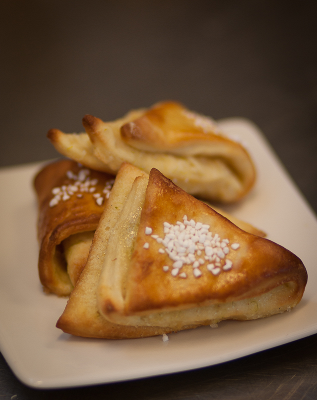 Gör precis som ovan, men gör en mandelfyllning och lägg en tsk av fyllningen vid basen av varje triangel innan du rullar ihop dem.