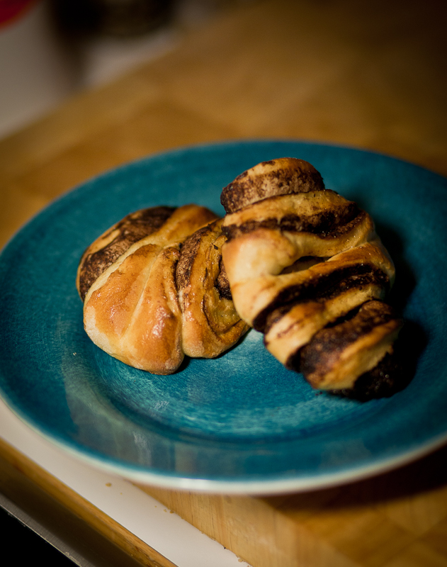 Skär degen i ca 6 cm långa bitar och lägg på plåt med bakplåtspapper. Pensla med uppvispat ägg och strö eventuellt över lite råsocker. Låt jäsa i 1,5 timme. Baka av i ugnen i 225 C i ca 12-15 minuter – de ska ha en relativt mörk färg för att vara riktigt frasiga. Låt svalna på galler och pudra florsocker och eventuellt lite smält choklad över innan servering.