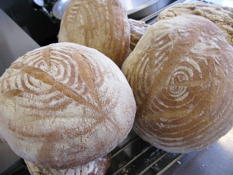 Sätt ugnen på 260 C. Jag lät bakstenarna värma en timme så att de höll god värme, men om du inte har sånt – stjälp upp degen på bakpapprad plåt. Mjöla och snitta degen med vass kniv eller rakblad, och så in med den i ugnen. Släng en skvätt hett vatten på ugnsbotten för ånga, stäng luckan och sänk sedan till 240 C (220 C varmluft). Låt gräddas i 50 minuter och låt sedan svalna på galler i minst en timme.