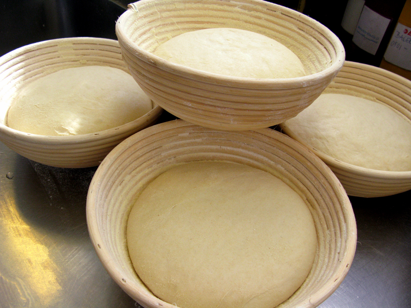 Kör maskinen på lägsta hastigheten i ca 10 minuter, och mjöla degen rikligt efter det och låt vila ytterligare 10 minuter i bunken. Stjälp upp på mjölat bakbord, vik den dubbel och lägg den sedan på mjölad handduk i plastlåda med tättslutande lock. Jag ställde den först i kylen i ca 6 timmar och tog sedan fram den i (sval) rumstemperatur i ca 8 timmar, tills den nått dubbel storlek.