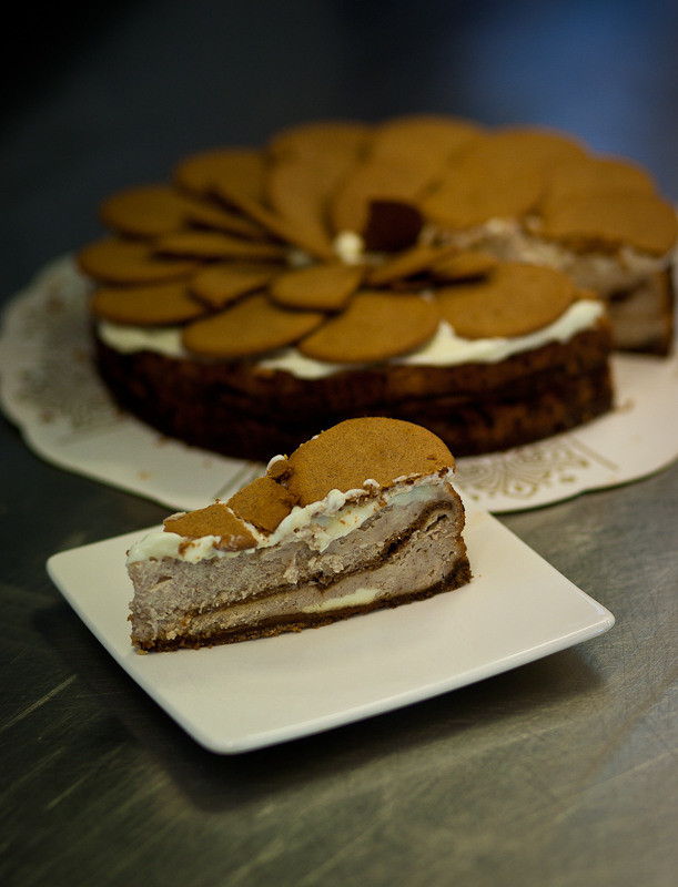 Häll hälften av smeten i formen och grädda i ca 15 minuter, tills den stelnat till. Ta ut formen ur ugnen och sänk temperaturen till 160 C. Lägg pepparkakor på den stelnade bottensmeten, och häll sedan försiktigt över resten av smeten. Sätt in i ugnen igen och baka av i ungefär 50 minuter – lägg på lite aluminiumfolie om cheesecaken mörknar för mycket. Den ska dallra lite grann i mitten om man skakar lätt på formen, men inte för mycket. Ta ut och låt svalna helt innan du lossar formen med en smal, vass kniv.